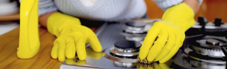We dust and wipe all appliances, counter tops, and cabinets. Scrub and sanitize sinks, clean the oven and stove, and wipe the refrigerator. Additionally, the microwave is cleaned inside and out. Finally, the floor is vacuumed and mopped.